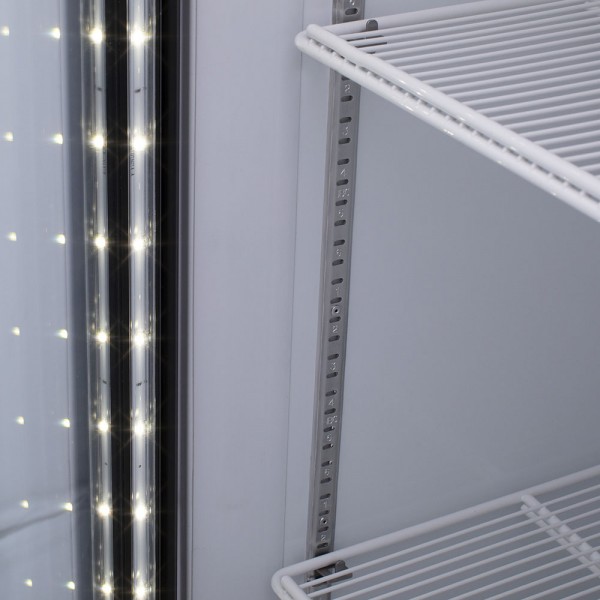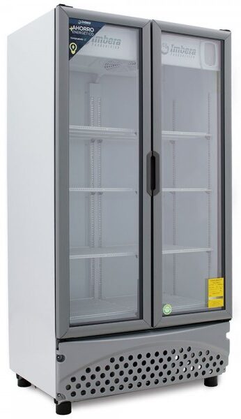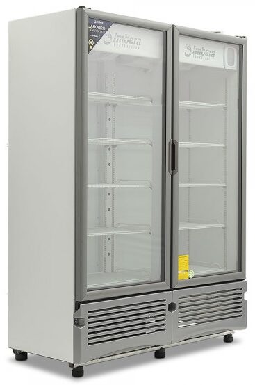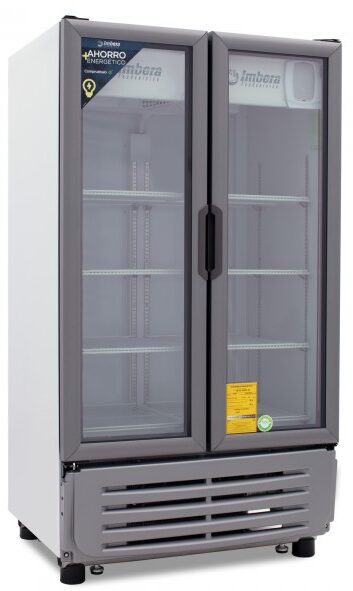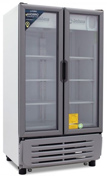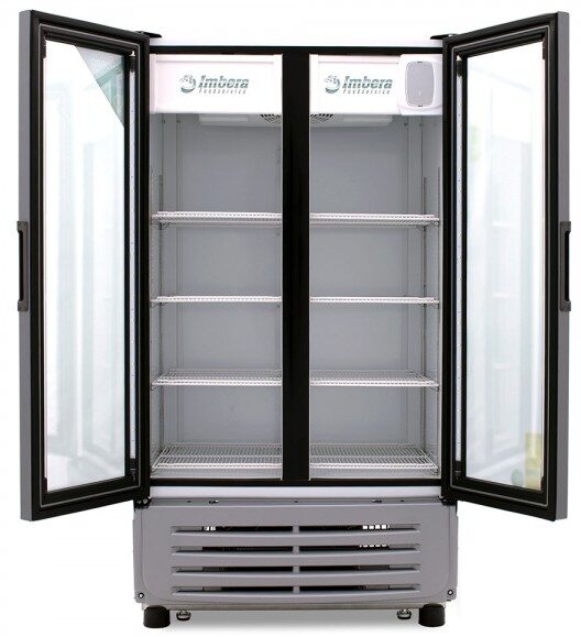 Refrigerador exhibidor Imbera de 2 puertas de cristal con capacidad de 42 pies³ y gabinete de color blanco ideal para una amplia exhibición de manera ordenada, visible y con un mayor control sobre todos los productos.