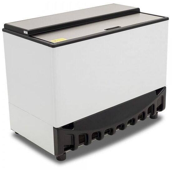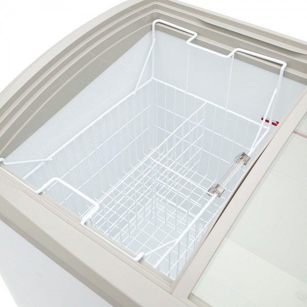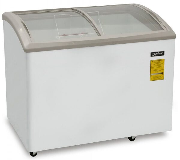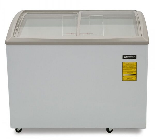 Congelador horizontal gris marca Imbera con tapas de cristal curvo deslizables de 10 pies³ ideal para un negocio que busca una óptima exhibición, visibilidad y accesibilidad a tus productos de manera organizada y sumamente estética.