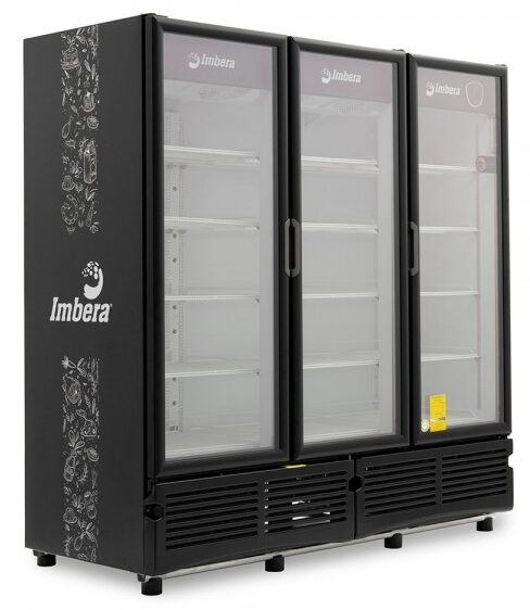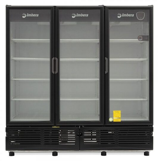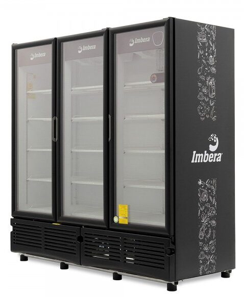 Refrigerador exhibidor de mostrador Imbera de 3 puertas de cristal con capacidad de 72 pies³ de 1350 botellas y gabinete de color negro ideal para un negocio de venta de cervezas que requiere una amplia exhibición de manera ordenada muy visible.