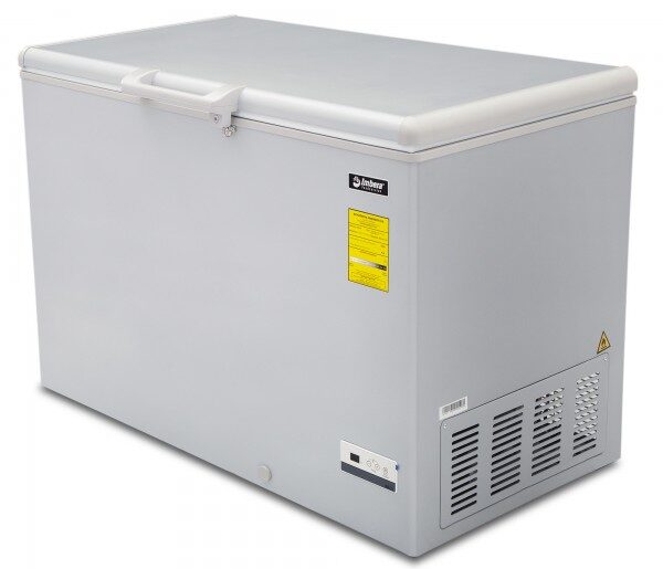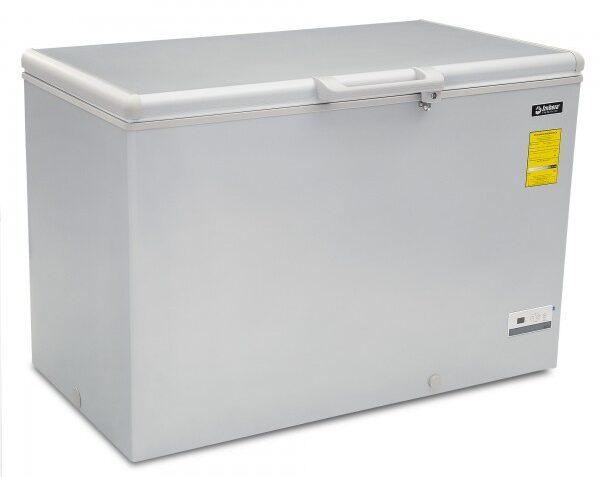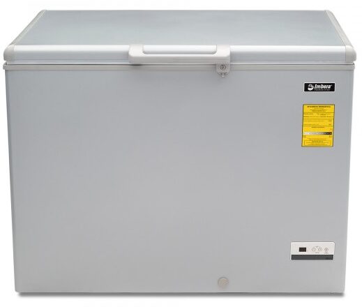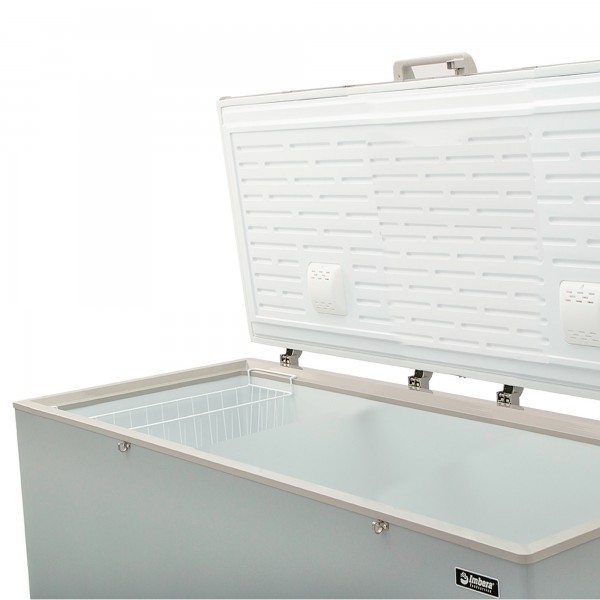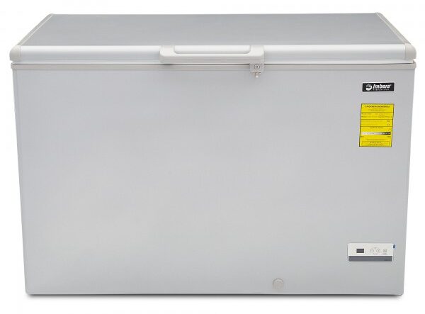 Congelador horizontal gris marca Imbera con tapa de cofre de 15 pies³ ideal para agregar espacio versátil adicional de almacenaje congelado a tu negocio mediano con congelación relámpago.