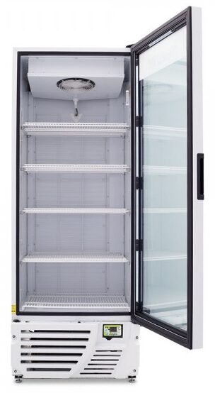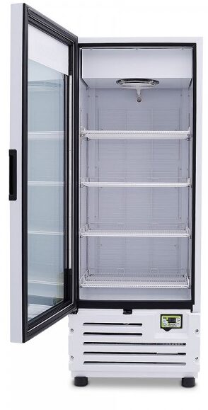 Refrigerador exhibidor Imbera de puerta de cristal con capacidad de 20 pies³ y gabinete de color blanco ideal para un espacio de un negocio en el que se requiere la mayor accesibilidad a la exhibición de productos fríos