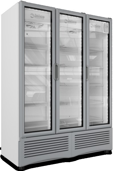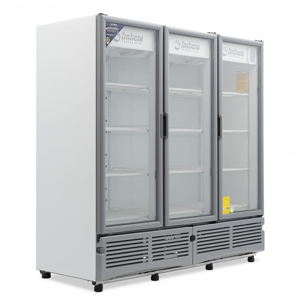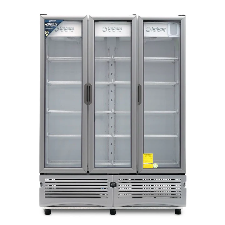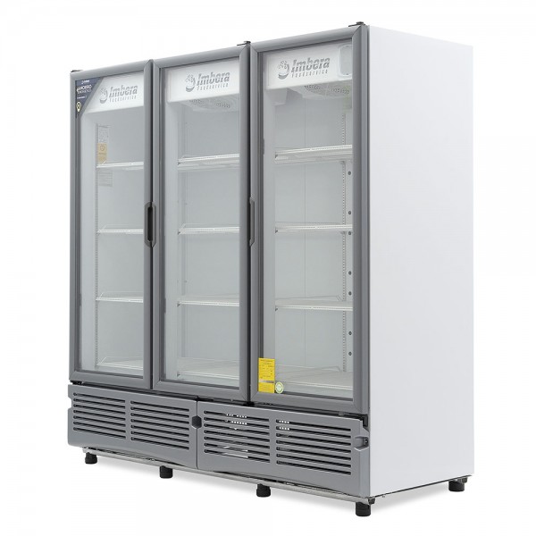 Refrigerador exhibidor Imbera de 3 puertas de cristal con capacidad de 72 pies³ y gabinete de color blanco ideal para una amplia exhibición de manera ordenada, visible y con un mayor control sobre todos los productos.
