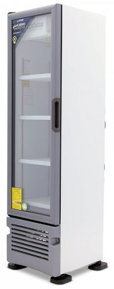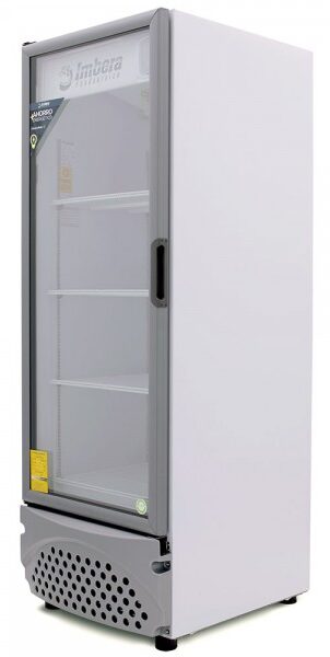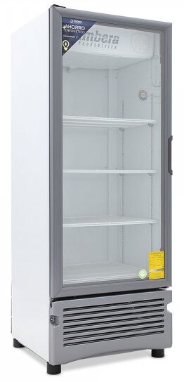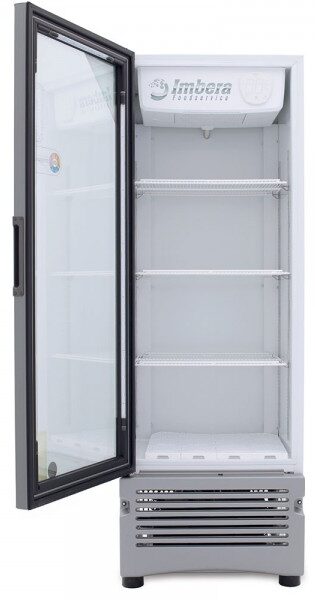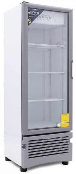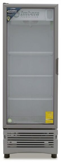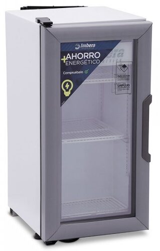 Refrigerador exhibidor Imbera de puerta de cristal con capacidad de 17 pies³ y gabinete de color blanco ideal para negocios de venta de productos o bebidas que apenas arrancan y buscan optimizar al máximo el espacio de exhibición.