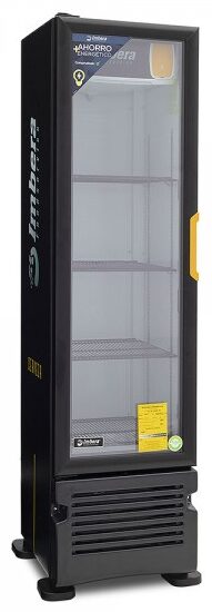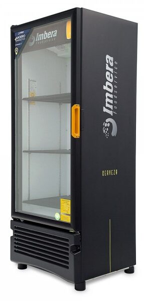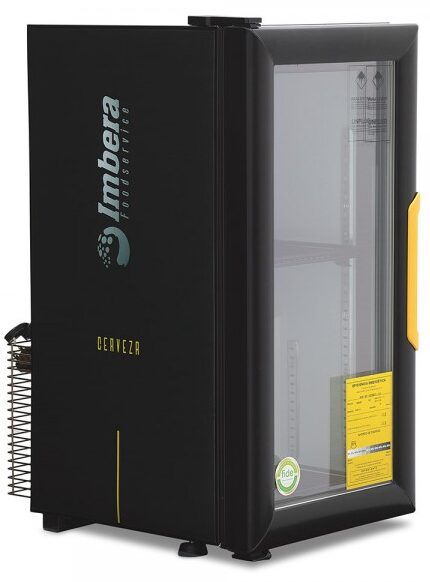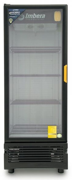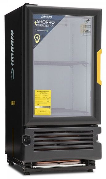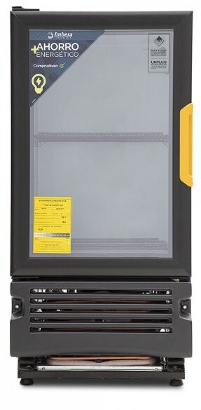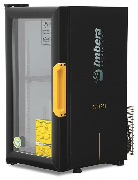 Refrigerador exhibidor de mostrador Imbera de puerta de cristal con capacidad de 8 pies³ de 144 botellas y gabinete de color negro ideal para un negocio que busca exhibir cervezas en primera posición en óptimas condiciones