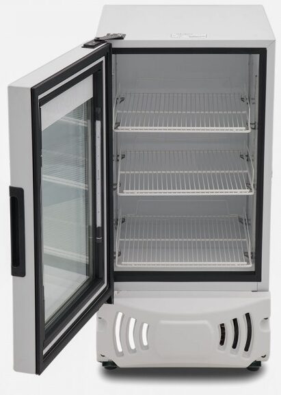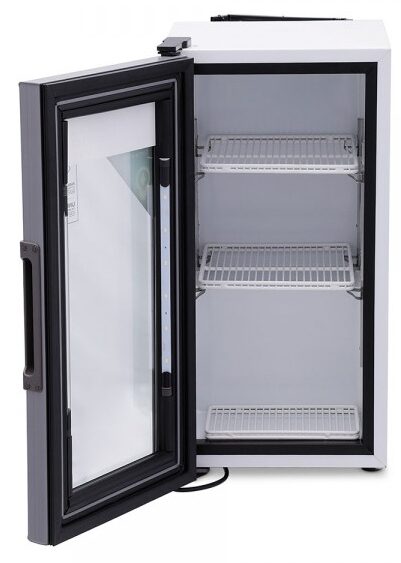 Refrigerador exhibidor de mostrador Imbera de puerta de cristal con capacidad de 1.5 pies³ y gabinete de color blanco ideal para un negocio que requiere apoyar lanzamientos de productos de forma atractiva.