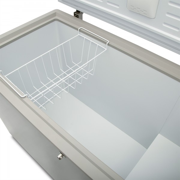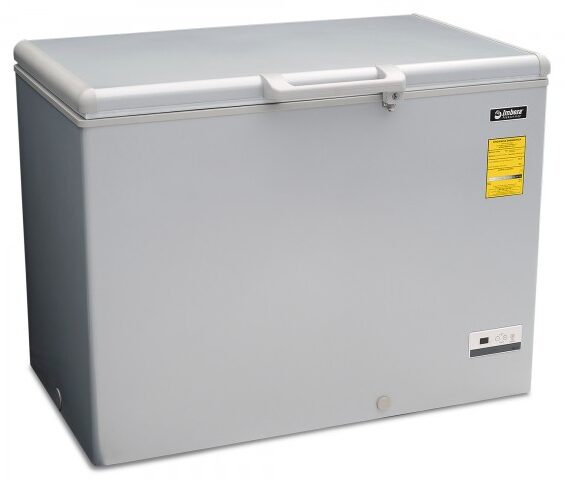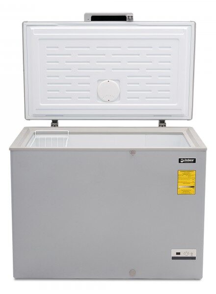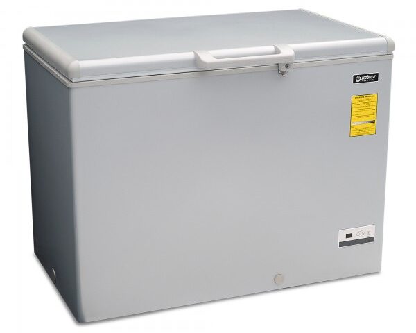 Congelador horizontal gris marca Imbera con tapa de cofre de 10 pies³ ideal para agregar espacio adicional de almacenamiento y congelado relámpago en tu restaurante, cafetería o bar.