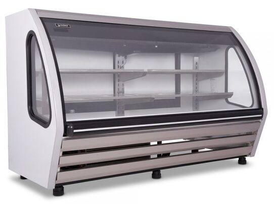 Vitrina delicatessen Imbera disponibles en color blanco y negro de 1.8 m de largo ideal para una pastelería, productos lácteos entre otros, para una tienda de abarrotes o un comercio minorista de tamaño pequeño.