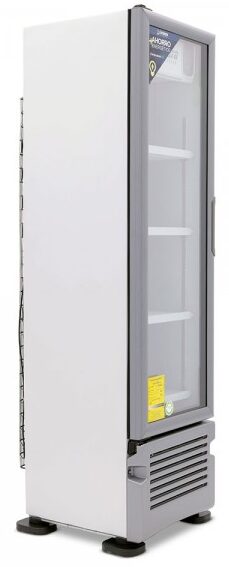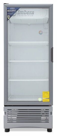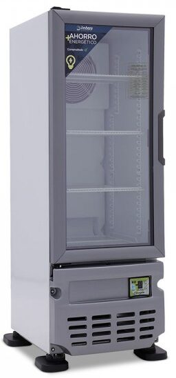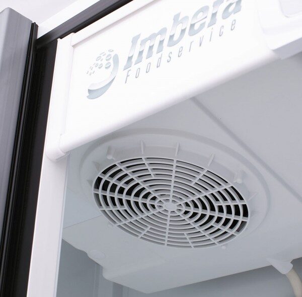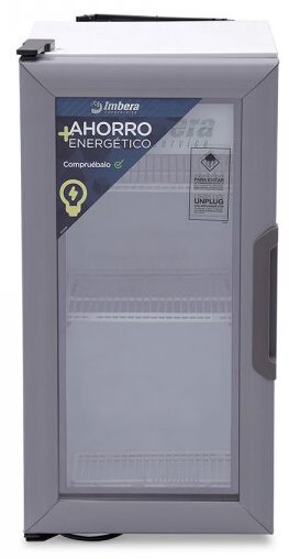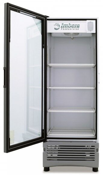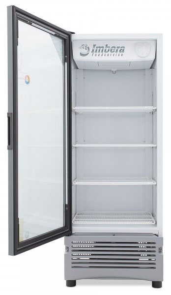 Refrigerador exhibidor Imbera de puerta de cristal con capacidad de 12 pies³ y gabinete de color blanco para maximizar el espacio de exhibición con calidad y fácil acceso.