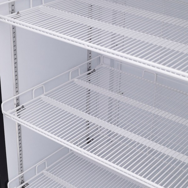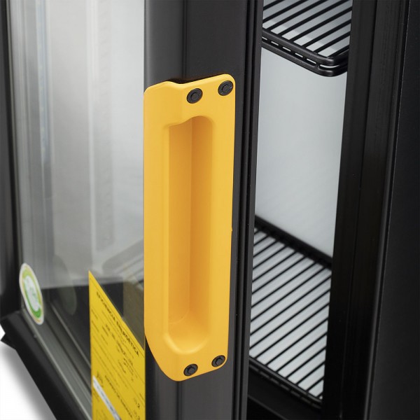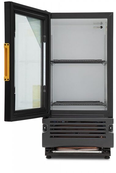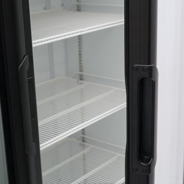 Refrigerador exhibidor de mostrador Imbera de puerta de cristal con capacidad de 25 pies³ de 500 botellas y gabinete de color negro ideal para un negocio de venta de cervezas que requiere la mayor accesibilidad a la exhibición de producto frío.