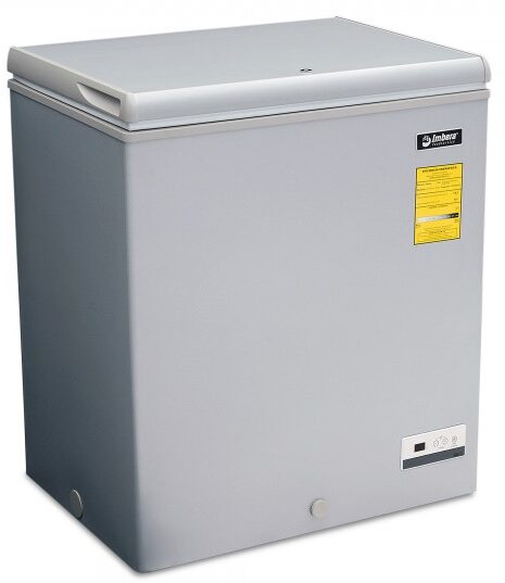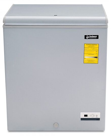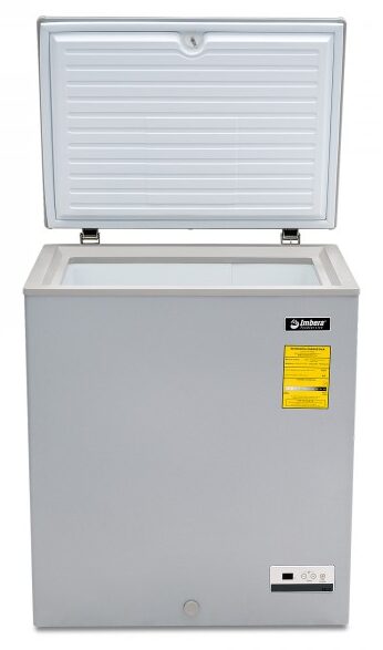 Congelador horizontal gris marca Imbera con tapa de cofre de 5 pies³ ideal para agregar espacio adicional de almacenamiento y congelado relámpago en tu restaurante, cafetería o bar.