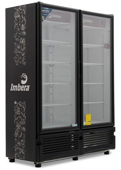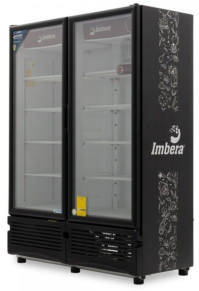 Refrigerador exhibidor de mostrador Imbera de 2 puertas de cristal con capacidad de 42 pies³ de 900 botellas y gabinete de color negro ideal para un negocio de venta de cervezas que requiere capacidad de exhibición de producto frío.