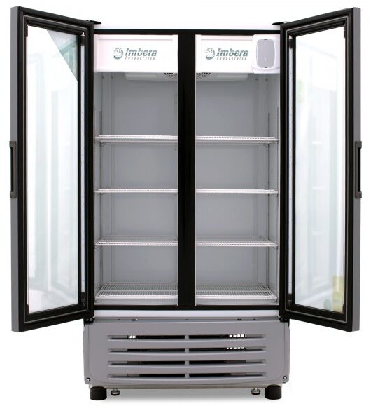 Refrigerador exhibidor Imbera de 2 puertas de cristal con capacidad de 35 pies³ ideal para optimizar el espacio de exhibición de baja altura de bebidas o productos en óptimas condiciones.