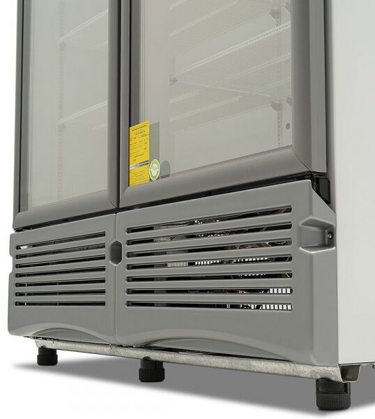 Refrigerador exhibidor Imbera de 2 puertas de cristal con capacidad de 19 pies³ y gabinete de color blanco ideal para optimizar el espacio de exhibición de baja altura de bebidas o productos en óptimas condiciones