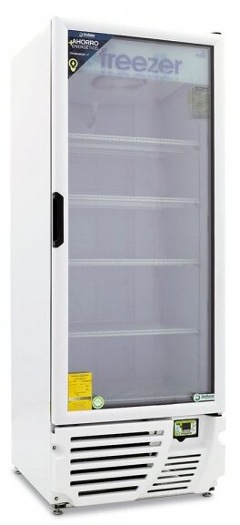 Congelador exhibidor Imbera de puerta de cristal con capacidad de 16 pies³ y gabinete de color blanco ideal para un negocio que busca maximizar la exhibición ordenada y visible.