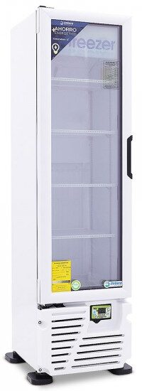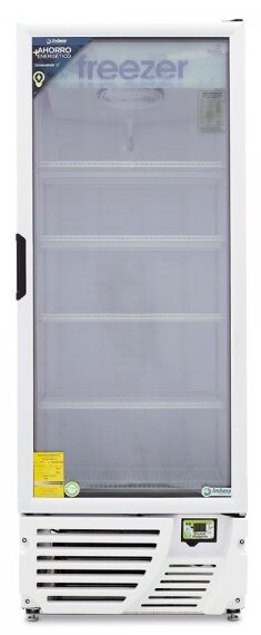 Congelador exhibidor Imbera de puerta de cristal con capacidad de 8 pies³ y gabinete de color blanco ideal para un negocio que busca maximizar la exhibición ordenada y visible.