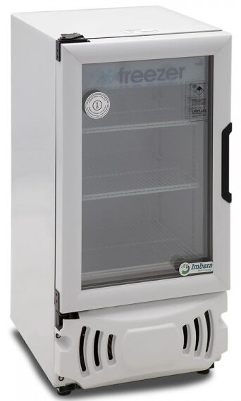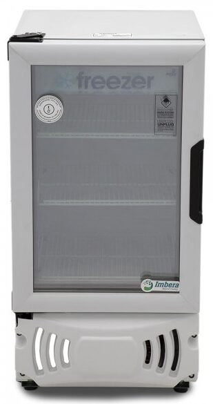 Congelador exhibidor Imbera de puerta de cristal con capacidad de 4 pies³ y gabinete de color blanco ideal para un negocio que busca maximizar la exhibición ordenada y visible.