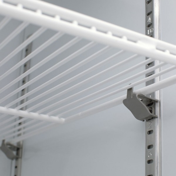 Cuatro parrillas ajustables que pueden unirse fácilmente a la pared del exhibidor en diferentes niveles.